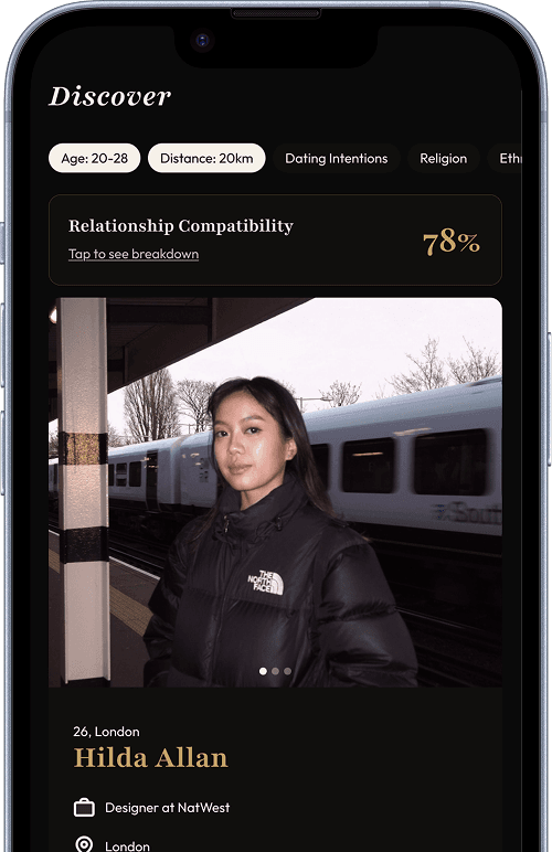 Our approach ends that. Answer curated question packs about your values, attachment style, and life goals. Every profile you see carries a score and a full breakdown of where you align and where you don't.